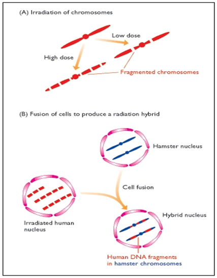 A radiation hybrid can also be used as a mapping reagent in STS mapping which refers to a hamster cell line carrying a relatively small DNA fragment from the genome of a second organism (such as human). For example, formation of radiation hybrid between human cell and hamster cellas shown in Figure 6-5.3(b).3.3 . After fusion of the two cells, the presence of markers in human DNA within the hybrid cell line is analyzed by hybridization or PCR methods. Same radiation hybrid will result if the two markers are close together thereby having greater probability to be on the same DNA fragment.
