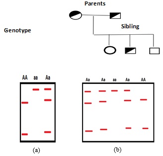 Figure 6-5.3(a).1.1: Restriction fragment length polymorphisms (RFLP): (a) shows the RFLP pattern homozygous and heterozygous parents.(b) The RFLP pattern of offspring which can be compared with parents to develop a RFLP map.