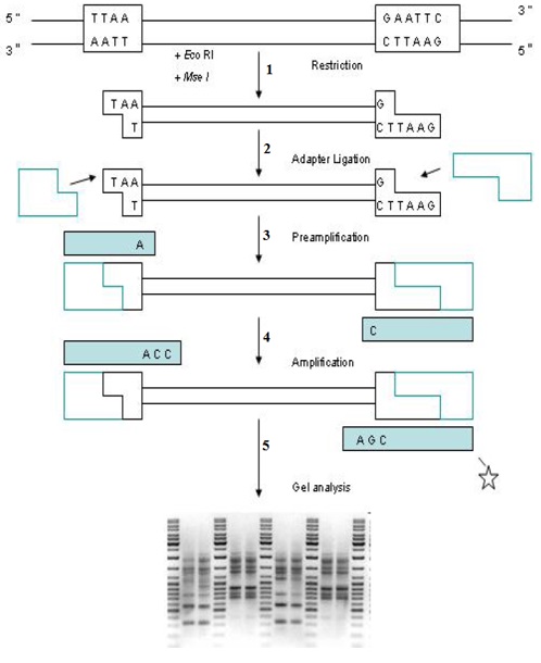 Figure 6-5.3(a).1.3: Steps involved in AFLP (1) Genomic DNA is digested with two restriction enzymes (in this case EcoRI and MseI) (2) Ligation of specific adapters to the digested fragments at both ends 3) & 4) PCR is performed in two steps first is pre-amplification and followed by amplification. (5) This is to visualize the result of AFLP in agarose gel and detection of bandsthrough silver stainingor by using labeledprimer (i.e. radioisotope or a fluorochrome). It is indicated by a star in the figure. (Adapted and modified from: Gabriel Romero et al 2009, Genetic fingerprinting: Advancing the frontiers of crop biology research)