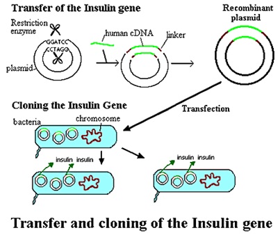 2. Preparation of target DNA: Circular piece of DNA called plasmid is obtained from bacteria. 3. Insertion of DNA into plasmid: The gene for insulin is inserted into the plasmid construct. The human insulin gene is now recombined with bacterial DNA.