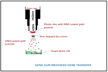 In particle bombardment method, the tungsten or gold particles (micro projectiles) are coated with the foreign DNA. Micro-projectile bombardment uses high-velocity metal particles to deliver biologically active DNA into the target cells. The macroprojectile is coated with the coated particles and is accelerated with air pressure and shot into plant the target tissue. A perforated plate is used, which allows the micro-projectiles to pass through to the cells on the other side of the plate and stops the macropojectile. Particle coated with the foreign gene releases the foreign gene when enters into the target cell and integrates into the chromosomal DNA. This technique is also used to transfer genes in mammalian cells. Mammalian cell lines like HEK 293, MCF7 showed gene expression when transfected with luciferase and green fluorescent genes and their gene expression was dependent on helium pressure, size and amount of gold particle and DNA load on each particle. Cell viability depends on helium pressure.