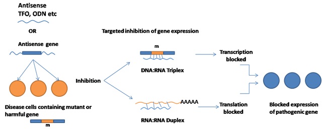 Figure 8-1.3.3: To inhibit the target gene expression in diseased cell the antisense mRNA coding gene inserted vector or triplex-forming oligonucleotides (TFO) or antisense oligonucleotide (ODN) can be introduced which will inhibit the gene expression either by forming DNA:RNA triplex inside the nucleus or forming RNA:RNA duplex by forming complementary mRNA strand of disease protein coding mRNA. This may lead to blocking of disease causing protein expression.