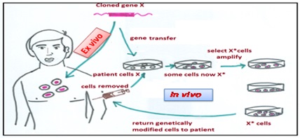 Figure 8-1.5: Gene Therapy using autologous cells: Cells are used, i.e. cells are removed from the patient, cultured in vitro, before being returned to the patient's body. In this figure in vivo and ex vivo gene therapy is diagrammatically explained.