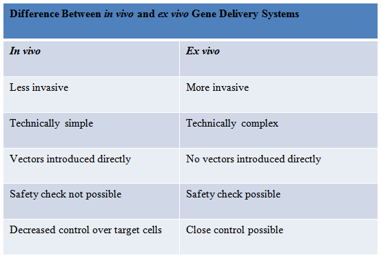 Table 8-1.5.1: Differences between In Vivo and Ex Vivo gene therapy