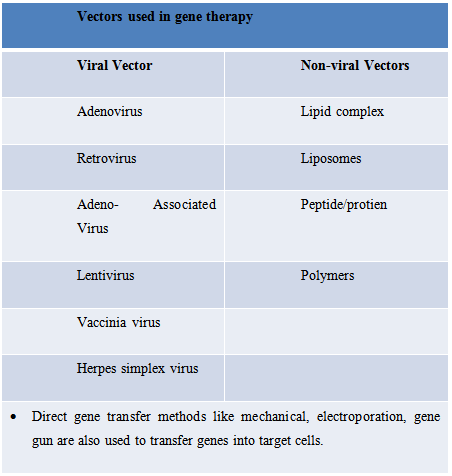 Retroviruses, adenoviruses and adeno-associated viruses (AAV) some commonly used viral vectors whereas some less commonly used viral vectors are derived from the Herpes simplex virus (HSV-1), the baculovirus etc.