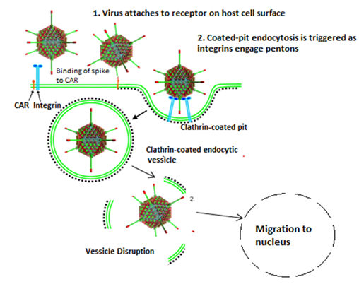 Adenoviruses are large linear double-stranded DNA viruses that are commonly used for preparing gene transfer vectors. Adenovirus vectors are known to be the second most popular gene delivery vector for gene therapy of various diseases like cystic fibrosis and certain types of cancer. Figure 8-1.7.1.1a shows how the adenoviruses enter cells by receptor-mediated endocytosis. A primary cellular receptor binds to viral fiber then the virus interacts with secondary receptors which are responsible for its internalization. Coxsackie and Adenovirus Receptor (CAR), Heparan sulphate glycosaminoglycans, sialic acid, CD46, CD80, CD86, alpha domain of MHC I are the primary receptors which are specific for specific strains of adenovirus. Integrins are the secondary receptors which helps in the internalization of viral particles. Some adenovirus directly interacts with integrins like in the case of fiber deficient Ad2 virions.