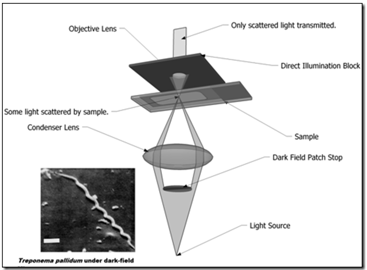 Living, unstained cells and organisms can be observed by changing the way in which they are illuminated. A dark field condenser that contains an opaque disc is used. The disc blocks light that would enter the objective directly. Only light that is diffracted by the specimen enters the objective lens (Fig. 3). The field surrounding a specimen appears black, while the object itself is brightly illuminated. It is based on light scattered at boundaries between regions having different refractive indexes. It is also used to identify bacteria like the thin and distinctively shaped Treponemapallidum, the causative agent of syphilis.