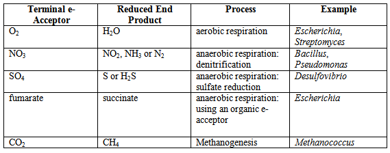 Respiration in some prokaryotes is possible using electron acceptors other than oxygen (O2). This type of respiration in the absence of oxygen is referred to as anaerobic respiration. Electron acceptors used by prokaryotes for respiration or methanogenesis (an analogous type of energy generation in archaea bacteria) are described in the table below.