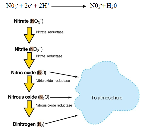 Some microbes are capable of using nitrate as their terminal electron accepter. The ETS used is somewhat similar to aerobic respiration, but the terminal electron transport protein donates its electrons to nitrate instead of oxygen. Nitrate reduction in some species (the best studied being E. coli) is a two electron transfer where nitrate is reduced to nitrite. Electrons flow through the quinone pool and the cytochrome b/c1 complex and then nitrate reductase resulting in the transport of protons across the membrane as discussed earlier for aerobic respiration.