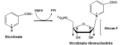 NAD+ synthesis requires nicotinate (vitamin B6), which is derived from tryptophan. In the first step, nicotinate ribonucleotide is formed from nicotinate and PRPP: