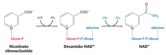 In the following steps, an AMP moiety is transferred from ATP to nicotinate ribonucleotide to form desamido-NAD+. Finally, the carboxyl group of desamido-NAD is converted to amide using glutamine as an ammonia donor:
