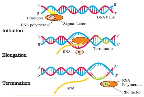 - In eukaryotic cells, transcription termination involves cleavage of the elongating RNA chain by specific endonucleases which recognize particular sequences (AAUAAA) in the newly formed RNA. Once this happens, the RNA elongation complex is destabilized, and falls off the DNA. It is then available to attach to another nearby PIC, and start transcribing again.