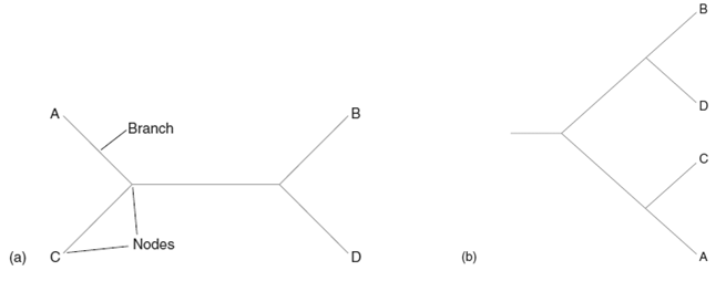 Fig. 3 . Phylogenetic tree. a) unrooted tree, b) rooted tree.