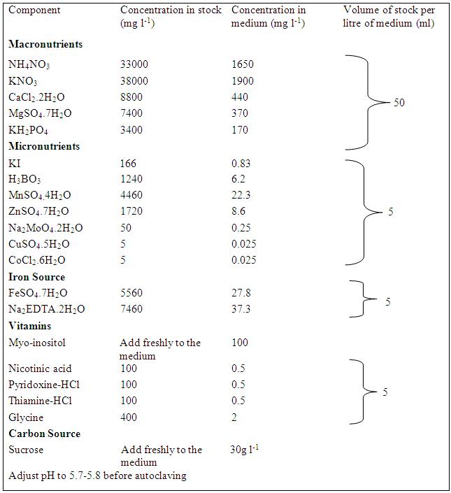 Myoinositol and sucrose are added freshly to the medium. Dissolve 5.56 g of FeSO4 .7H2O in 350 ml of water. Apply heat if needed. Dissolve 7.46 g of Na2 EDTA in 350 ml of water. Apply heat if needed. When both solutions are dissolved, combine and bring to 1 litre final volume. The chelation reaction is forced to completion by autoclaving. The final stock solution should be deep golden yellow in color. |