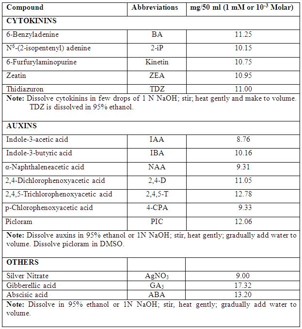 Table 3.4: Stock solutions of growth regulators