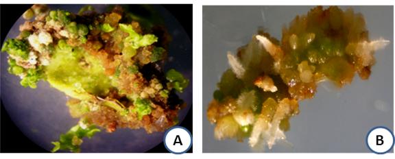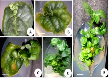 Regeneration of plant from the cultured explant may occur either through differentiation of shoot-buds or somatic embryogenesis (Figure 5.2 A-E, and Figure 5.3).