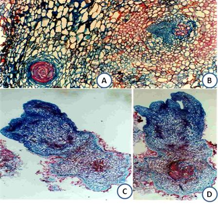 Figure 5.4: Shoot differentiation from callus tissue. A-B, Development of vascular nodules randomly in the callus, note a small shoot-bud originated from vascular tissue in figure B. C-D, Shoot-buds establish a connection with pre-existing vascular tissue developed from the callus |