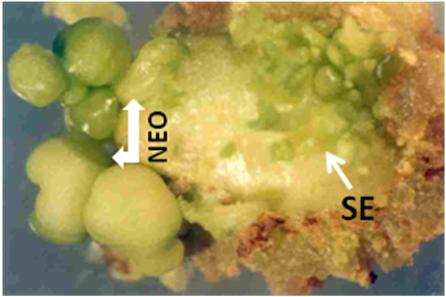 Figure 8.6: An explant showing differentiation of neomorphs (NEO) and somatic embryos (SE) on the same explant
