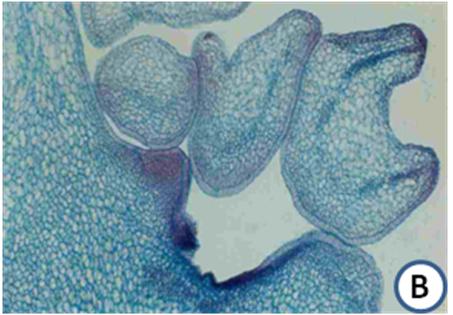B. A histological section of A, showing epidermal origin of a neomorph of various shapes. It has a well differentiated epidermis and compactly arranged internal cells. These structures are loosely attached to the explant and show provascular strands.