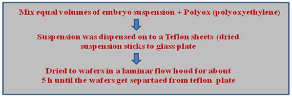 The polyox is readily soluble in water and dries to thin film. It does not support the growth of microorganism and is non toxic to the embryos. Embryo survival and conversion of seeds are determined by redissolving the wafers in embryogenic medium and culturing the rehydrated embryos.