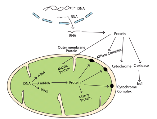 Mitochondrial DNA (mtDNA) is DNA that is present in Mitochondria. Mitochondrion is the part of organic cells that produce most of the cellular energy by converting organic materials mode into Adenosine Tri-phosphate (ATP) mode via the process of oxidative phosphorylation. The details of mitochondrial functions are elaborated in Figure 21.8. Typically nuclear DNA determines the function of a cell; however mitochondria have their own DNA and are assumed to have evolved separately (Endosymbiotic theory). Mitochondria have their own genome, usually multiple copies in one mitochondrion, in circular form, located in several nucleoid regions, with no histone association (naked). Mitochondrial genome size varies with organism to organism, plants have mitochondrial average 150-200 kb, but human mitochondria genome is only 16 kb. Mitochondrial DNA encodes enzymes required for oxidative phosphorylation and mitochondrial electron transfer. A cell can have different types of mitochondria (heteroplasmy) or same type of mitochondria (homoplasmy). Mitochondrial DNA analysis is helpful in forensic cases in which nuclear DNA is insufficient for short tandem repeat (STR) typing. Shed body, head, and pubic hairs with no cellular material (hair follicle) attached to the root bulb and aged skeletal remains are the samples most commonly analyzed for mtDNA because nuclear DNA is not recoverable from these tissues. Usually a cell has hundreds or thousands of mitochondria which can occupy up to 25% of the cell's cytoplasm, and each mitochondrion contains 1-10 mtDNA molecules. The high copy number of mtDNA molecules found in each cell is one reason why mtDNA is recoverable from hairs and old skeletal remains.