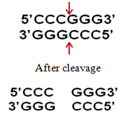 b) Sma I restriction enzyme cleavage produces "blunt" ends: