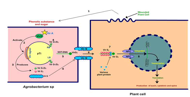 Wounded plant cell releases phenolics substances and sugars (1); which are sensed by vir A, vir A activates vir G, vir G induces expression of vir gene of Ti-plasmid (2); vir gene produce all the vir -protein (3); vir D1 and vir D2 are involve in ssT-DNA production from Ti-plasmid and its export (4) and (5); the ssT-DNA (with associated vir D1 and vir D2) with vir E2 are exported through transfer apparatus vir B (6); in plant cell, T-DNA coated with vir E2 (7); various plant proteins influence the transfer of T-DNA + vir D1 + vir D2 + vir E2 complex and integration of T-DNA to plant nuclear DNA(8). (LB= left border; RB= Right border; pTi = Ti plasmid, NPC = nuclear pore complex)
