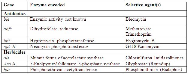 Genetic selection of transformed cells is a significant step of any plant transformation. Screening of transformed cells or plants for gene integration and expression in transformed cells or plants is a process that involves several techniques, including DNA and RNA blot hybridization analysis, PCR, ELISA analysis. In the absence of a correct selection system one would face with the option of screening every shoot that regenerates in a transformation experiment. In cases where transformation frequency is high this may be possible but for plant species that transform with low frequencies this would be a laborious, if not impossible, task. Therefore, a selectable marker gene (Table 27.1) is incorporated into the plant transformation vectors and an appropriate selecting agent is added to the culture medium which favors the growth of only transformed cells. The genes used as selectable markers are dominant and typically of bacterial origin. For successful selection, the target plant cells must be susceptible to moderately low concentrations of the selecting agent in a non-leaky way. The compound that inhibits the growth but does not kill the wild type cells is preferred as a selecting agent in plant transformation. The concentration of the selecting agent used varies widely depending on the sensitivity of the plant species and/or explant source.