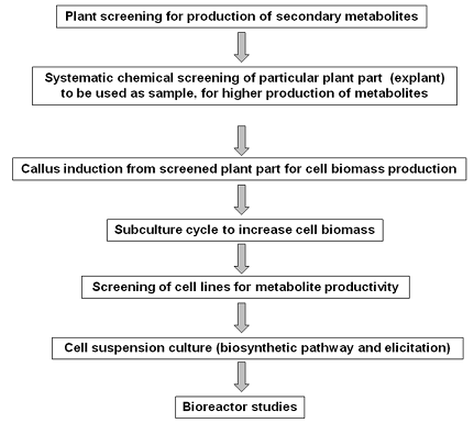 Plants produce several bioactive compounds that are of importance in the healthcare, food, flavor and cosmetics industries. Many pharmaceuticals are produced from the plant secondary metabolites. Currently, many natural products are produced solely from massive quantities of whole plant parts. The source plants are cultured in tropical, subtropical, geographically remote areas, which are subject to drought, disease and changing land use patterns and other environmental factors.