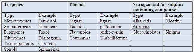 Secondary metabolites can be derived from primary metabolites through modifications, like methylation, hydroxylation and glycosylation. Secondary metabolites are naturally more complex than primary metabolites and are classified on the basis of chemical structure (e.g., aromatic rings, sugar), composition (containing nitrogen or not), their solubility in various solvents or the pathway by which they are synthesized (Table 31.1). They have been classified into terpenes (composed entirely of carbon and hydrogen), phenolics (composed of simple sugars, benzene rings, hydrogen and oxygen) and nitrogen and/or sulphur containing compounds (Figure 31.2). It has been observed that each plant family, genus and species produces a characteristic mix of these bioactive compounds.