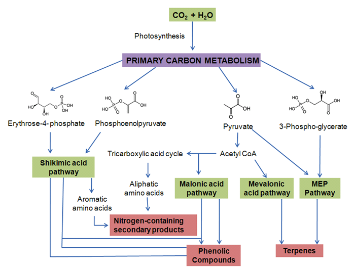 Figure 31.2: The production of secondary metabolites is tightly associated with the pathways of primary/central metabolism, such as glycolysis, shikimate and production of aliphatic amino acids.