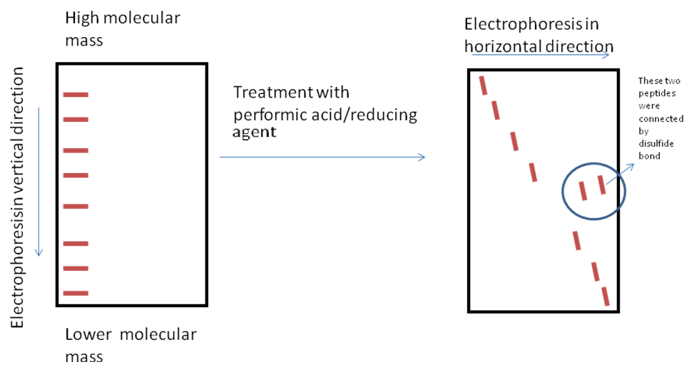 Another form of non denaturing SDS-PAGE is called diagonal electrophoresis: Peptide joined together by disulfide bond can be detected by diagonal electrophoresis. The mixture of peptide is subjected to electrophoresis in single lane in vertical direction (without treatment with reducing agents). After first run, gel is treated with reducing agent and run in second direction (horizontal). Peptide joined by disulfide will not come in diagonal line in second direction as their molecular mass changes due to reduction of disulfide bonds (peptides are separated)