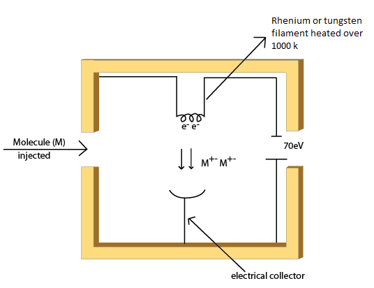 The electron beam is produced by a filament of rhenium or tungsten wire by thermionic emission. When cathode filament of rhenium or tungsten is heated at temperature over 1000 K, electrons are emitted. The generated electrons are accelerated to 70 eV which results in electron beam. The volatile sample or sample in gaseous phase containing neutral molecules is introduced to the ion source in a perpendicular direction to the electron beam. Electron impact on the analyte results in either loss of electron (to produce cation) or gain of electron (to produce anion). Chemical bonds in organic molecules are formed by pairing of electrons. Electron impact may knock out one of the electron. This leaves the bond with a single unpaired electron. This is radical as well as being cation written as M+., where (+) indicates ionic state while ( . ) indicates radical. Electron impact may result in electron capture (extra unpaired electron). This generates a radical as well as being anion written as M+., where (-) indicates ionic state while ( . ) indicates radical (Fig. 5.)