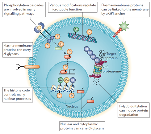 Figure: Cellular post-translational modifications. This schematic figure shows the location and role of a selection of some of the most important of more than 200 types of post-translational modification (PTM). PTMs are found on all types of protein, from nuclear transcription factors to metabolic enzymes, structural proteins and plasmamembrane receptors. PTMs affect the physicochemical properties of proteins, which provides a mechanism for the dynamic regulation of molecular self-assembly and catalytic processes through the reversible molecular recognition of proteins, nucleic acids, metabolites, carbohydrates and phospholipids. Ac, acetyl group; GPI, glycosylphosphatidylinositol; Me, methyl group; P, phosphoryl group; Ub, ubiquitin (Nature Reviews Molecular Biology, 2006, 7, 391-403)