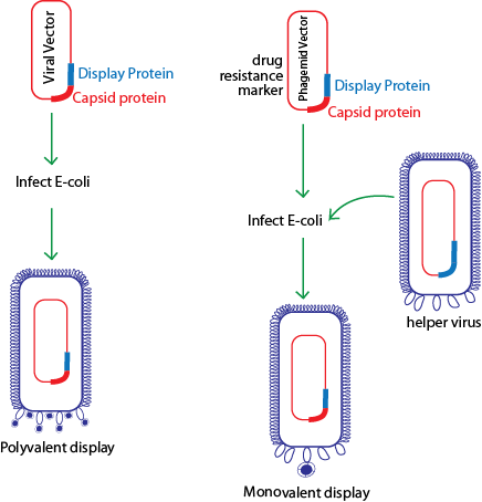 Figure 3: Proteins fused to capsid proteins can be displayed in either of the two formats. Protein can be cloned directly into a viral vector as a fusion to a capsid protein resulting in every copy of the capsid protein displaying the fusion (polyvalency). In case of polyvalent display all gpIII are conjugated with peptide and this results in occasional lost of infectivity. Alternatively, the protein fusion can be constructed in a phagemid vector that carries a copy of the viral capsid gene. In this case, helper phages are mixed at the time of infection. As caspid protein also comes from helper phage (during viral assembly in E.coli ), infectivity of phage displaying peptide is not compromised. However, valency of display of peptide is decreased. This may have some disadvantages at the time of selection. The valancy of display depends on ratio of phage containing phagemid vector and helper phage at the time of infection. Since the helper phage do not carry a drug resistance marker, they are lost upon subsequent selection for drug resistance.
