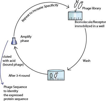 Fig. Selection of desired protein (Biopanning) : Bimolecule /receptor against which a protein/peptide is being designed was immobilized in the wells of a microtitre plate and probed with the phage peptide library. Unbound phages were removed by washing and then the bound phage were eluted with acid and amplified in liquid culture. The process was repeated 3-4 times and finally the phage was sequenced to identify the expressed protein sequence with high affinity. The process by which phage displaying desired protein sequence is enriched is called biopanning