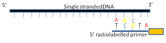 In order to perform the sequencing, the first step is the annealing of a gene specific or a universal oligonucleotide primer to the recombinant M13 vector or single stranded DNA. This primer acts as a starting point for the DNA polymerases enzymes for the complementary strand synthesis. Primer is generally radiolabelled to generate the autoradiograph. The label may also introduce into the new strand by adding radiolabelled deoxynucleotides e.g. S 35 or P32 in the reaction mixture (Fig.2).