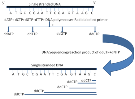 After complete run, the gel is transferred on nitrocellulose filter and autoradiography is performed so the only bands having the 5' radiolabelled molecule will be visible as bands. In PAGE the shortest fragment moves faster so the bottom most molecule is the first dideoxynucleotide which stopped the chain elongation by its incorporation and thus that should be the first sequenced nucleotide. So by this bottom up approach in all the lanes we can get a combined DNA sequence of the query (Fig .4).