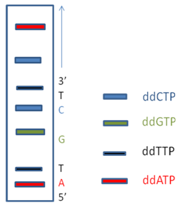 Fluorescence DNA sequencing or automated DNA sequencing implies the same procedure as in Sanger's method but with one major difference. In Sanger's method, detection is done by developing autoradiograph with radiolabelled primer which makes it lengthy and time consuming and it can be used as an ideal throughput procedure due to its health hazardousness. To get rid of these problems, in automated DNA sequencing, fluorescent molecules are being used instead of radiolabelled. Fluorescent dye labels are incorporated into DNA extension products using 5' labelled primers (dye primers) or 3' labelled dideoxynucleotide triphosphates i.e. Dye terminators. Usually the fluorescent labelling is done at 3' end of dideoxyNTP so different type of fluorochromes can be used for each ddNTP and whole reaction can be carried out in a single tube. Each dye may have a different emission wavelength when excited with an argon ion laser. Thus all four bases can be distinguished by the emission of four different colors, in a single gel lane (Fig. 5A) or by capillary electrophoresis (Fig. 5 B,C,D). Capillaries are small, a 50 μm inner diameter, and they dissipate heat very efficiently due to their high surface area to volume ratios. Thus a capillary based system can be run with much higher voltages and it dramatically lowering the run time. Most importantly, capillary systems can be automated which is a major limitation in gel based systems.