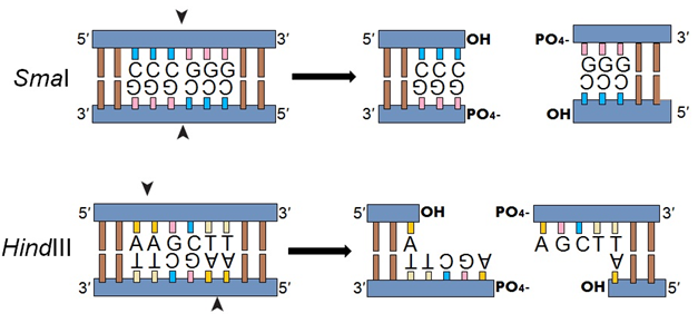 Figure 1:Cleavage patterns of Hin d III and Sma I restriction endonucleases. The recognition sites and cleavage patterns of Hin dIII and Sma I are shown. Restriction endonucleases catalyze the hydrolysis of phosphodiester bonds in palindromic DNA sequences to produce double-strand breaks, resulting in the formation of 5'-PO 4 - and 3'-OH termini with "sticky" ends (Hin dIII) or "blunt" ends (Sma I).
