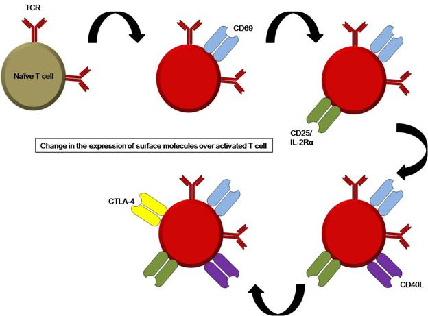 After activation T lymphocyte undergoes various phases of differentiation that leads to continual changes in the expression of the surface molecule markers. A plasma protein, CD69 expresses after few hours of T lymphocyte activation, they help to retain the lymphocyte inside lymphoid organs for its differentiation into effector and memory immune cells. The activated T lymphocyte then expresses receptors for cytokines IL-2 called CD25 (IL-2Rα), which helps to promote the growth of activated T cells. Following 24 to 48 hours of T cell activation, ligands for CD40 (CD40L) expresses over the lymphocyte that helps to produce an effector immune response against peptide loaded over the macrophages and B cells. To balance the activated T cell response CTLA-4 expresses over the cells to inhibit the exaggerated T cell activation. After these all events of surface expression, T cells express the molecules that help them to migrate to lymphoid organs such as L-selectin and leukocyte function antigen-1 (LFA-1).