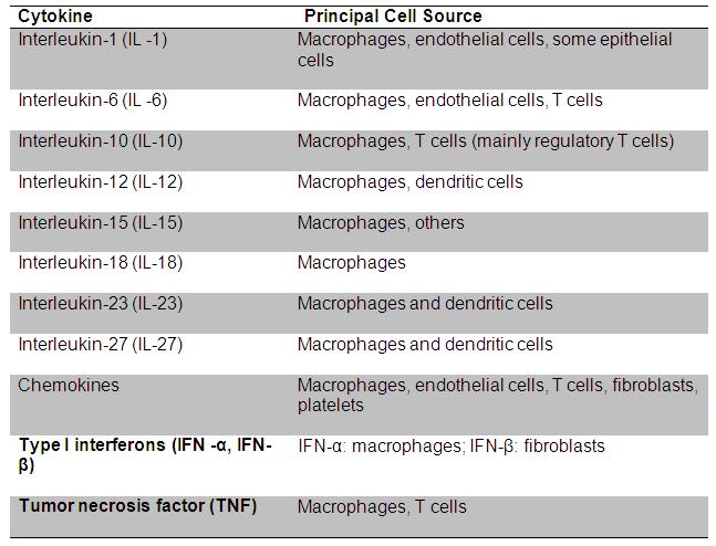 Table 23.2 Different cytokines and their source: