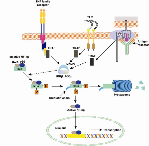 NF-κβ has its origins in the family of five transcription factors that play a crucial role in inflammation and immunity. There are more than 150 genes that get expressed on NF-κβ stimulation. There are three major pathways for NF-κβ activation. These are the classical pathway , alternative pathway and the third pathway that is stimulated by DNA damaging drugs and Ultraviolet light. The classical pathway involves proinflammatory signaling and gets activated by inflammatory cytokines, TLRs and antigen receptors (figure 24.1). IKK (Iκβ) complex is the central regulator of NF-κβ and all the signals induced by various stimuli focus on the same complex IKK. IKK complex is rich with kinase activity and on activation IKK complex phosphorylates Iκβ. Consequently Iκβ dissociates from the NF-κβ and the newly formed Iκβ becomes ubiquinated and is destroyed by proteasomes. Dissociation between Iκβ and NF-κβ liberates NF-κβ and it enters the nucleus to activate κβ motif containing promoters on DNA. This stimulates many genes and cytokines IL-1β, IL-6, IL-18, IL-33, TNF-α, GM-CSF, and IL-4. The second pathway or alternative pathway is required for lymphocyte development and is stimulated by a subset of TNF receptors. The third pathway does not require any IKK activation.