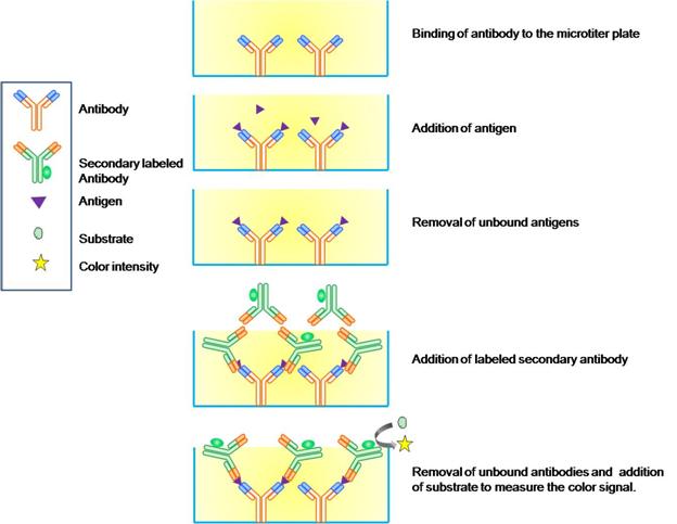 Quantification of the antigen is a valuable data in both basic and clinical research sciences. Immunochemical methods of antigen quantitation are usually based on reactivity of pure antigen and antibody with an indicator molecule. When the antigen or antibody is labeled with a radioisotope it can be quantified by the decay of radioactive element by the assay called Radioimmunoassay (RIA) . When the antigen or antibody binds with an enzyme, it can be quantified by spectrophotometer reading upon conversion of substrate into a color by the enzyme, the assay is called an enzyme-linked immunosorbent assay (ELISA) . Many forms of RIA and ELISA exist but the most commonly used one is the sandwich method in which two different forms of antibodies are used against different areas of an antigen. Briefly, a known quantity of antibody is attached to the solid support in a microtiter plate. The antigens to be tested are used in different concentration along with a known concentration of control antigens and are allowed to react. The unbound antigens are washed with the appropriate solution and an enzyme linked or radiolabeled second antibody is added to react with the complex. The results from the standard solutions are used to construct the standard curve and accordingly the quantification of the test antigen is completed.