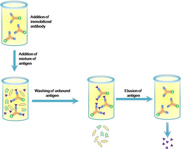 Immuno-affinity chromatography is a method in which specific antibodies are bound to an insoluble support. A mixture of antigens is allowed to pass through the column that contains the bound antibodies. The antigens bind to the antibodies based on their specificities and the unbound ones are washed out. The bound antigens are eluted form a specific antibody by changing the pH or high salt concentration which breaks the bond between antigen and antibodies. The same method can be used to identify the specific antibody by binding the antigen to an insoluble support. It is a useful technique to identify and purify the specific antigen or antibody from a sample.