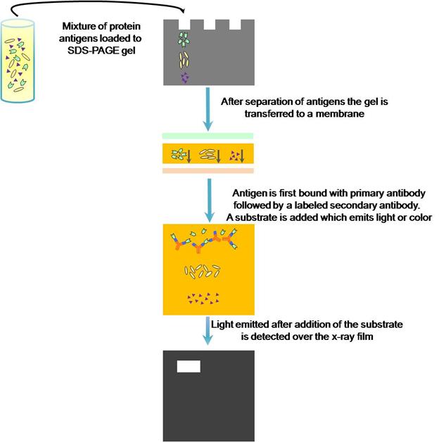 It is the most popular and widely used method to identify and determine the size of an unknown protein. The mixtures of protein are first subjected to an SDS-PAGE, so that the proteins can be separated based on their size. The gel is then transferred in to a nitrocellulose membrane in a way to represent its exact replica. Protein band on the membrane is then detected by binding an antibody specific to that protein followed by a labeled secondary antibody which binds to the first antibody. The second antibody is labeled with an enzyme that generates chemiluminescent signals which can be detected over the x-ray film. The sensitivity and specificity of western blot can be increased by purifying the proteins first with Immunoprecipitation assay.