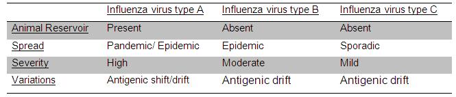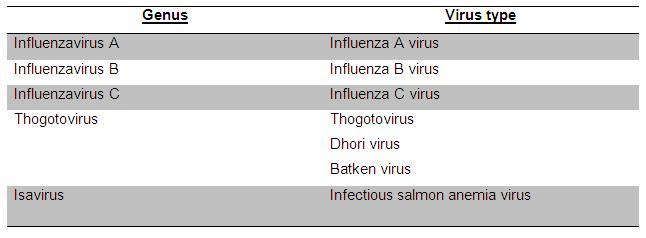 The family Orthomyxoviridae contains the genera Influenza virus A, Influenza virus B, Influenza virus C, Thogotovirus, and Isavirus.