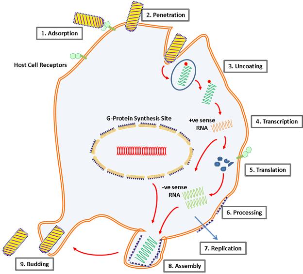 Figure 27.2 Schematic representation of rhabdovirus replication cycle: