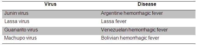 The family Arenaviridae contains the viruses which are usually associated with rodent-transmitted disease in humans. The virus particles are spherical with a diameter of around 110-130 nm. The virus contains negative strand RNA as a genetic material. Infection of Arenaviruses leads to hemorrhagic disease in humans that are often fatal.