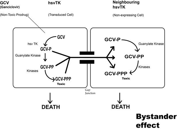 The tk gene sensitizes the tumor cells for a prodrug ganciclovir. Herepes virus tk is a normal substrate for the ganciclovir while the host tk is not affected by the drug. Therefore host cells surrounding the tumors will not have any effect of ganciclovir.